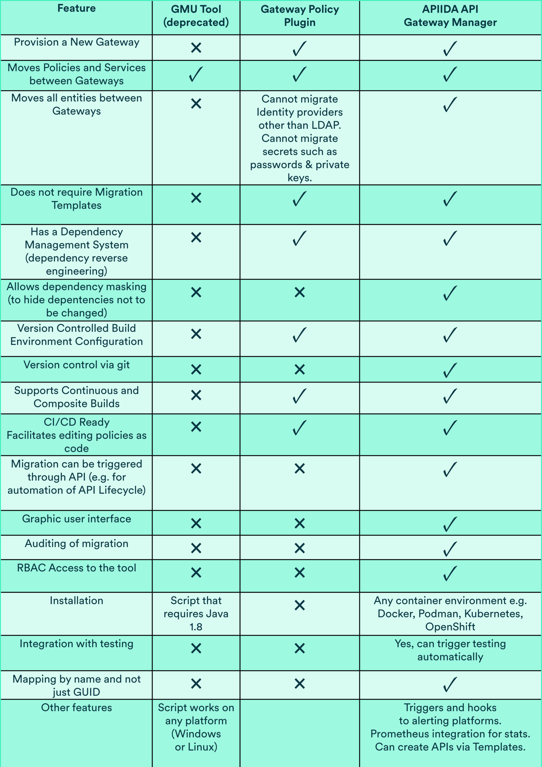We at APIIDA recognized the gap in the CA Broadcom tooling many years ago when ESM was still in use. We decided to create an “ESM on steroids”. We leveraged GMU, put a framework around it, created some mapping rules and gave it a shiny new UI. The result was the APIIDA API Gateway Manager. Sometime after, we realized that GMU was holding the product back, so we decided to use the Restman API directly and build our own dependency mapping structure around it. This gave the product extended capabilities like GIT integration, its own REST API, and dependency masking (showing and migrating ONLY the items you changed). This is not a free product but saves countless workforce hours and adds stability to your API Management solution.