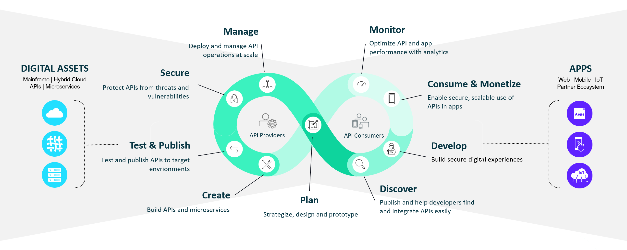 Full Life-Cycle API Management platforms span the whole life-cycle of an API. Starting with its design, following on with implementation, testing, securing, managing access to it and even monetization. The whole process is repeated during the life time of an API. Usually this ever continuing cycle is depicted using a moebius band.